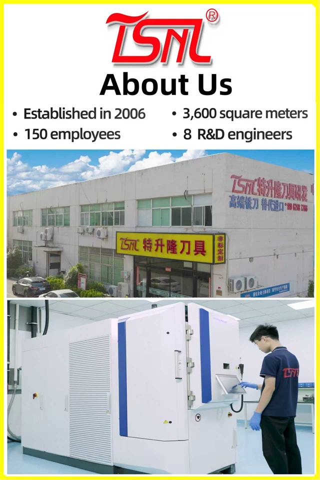 特升隆精密工具有限公司,2006年成立于中國昆山,專業生產研發高效鎢鋼刀具,我司擁有瑞士 ROLLOMATIC,德國WALTER,日本MAKINO SEIKI等生產設備,以及德國ZOLLER-GENIUS 3S,美國PG1000等檢測設備。鎢鋼原材料采用日本住友,德國鈷領等,部分刀具采用瑞士巴爾查斯涂層。獨特的刀具設計,嚴格的品質管控,為刀具的品質穩定性提供了強有力的保障。 我們將持續研發高品質,高效率,高穩定性的新產品。我司本著“誠信創新,專業技術,精良品質的原則”,竭力滿足廣大客戶的需求。